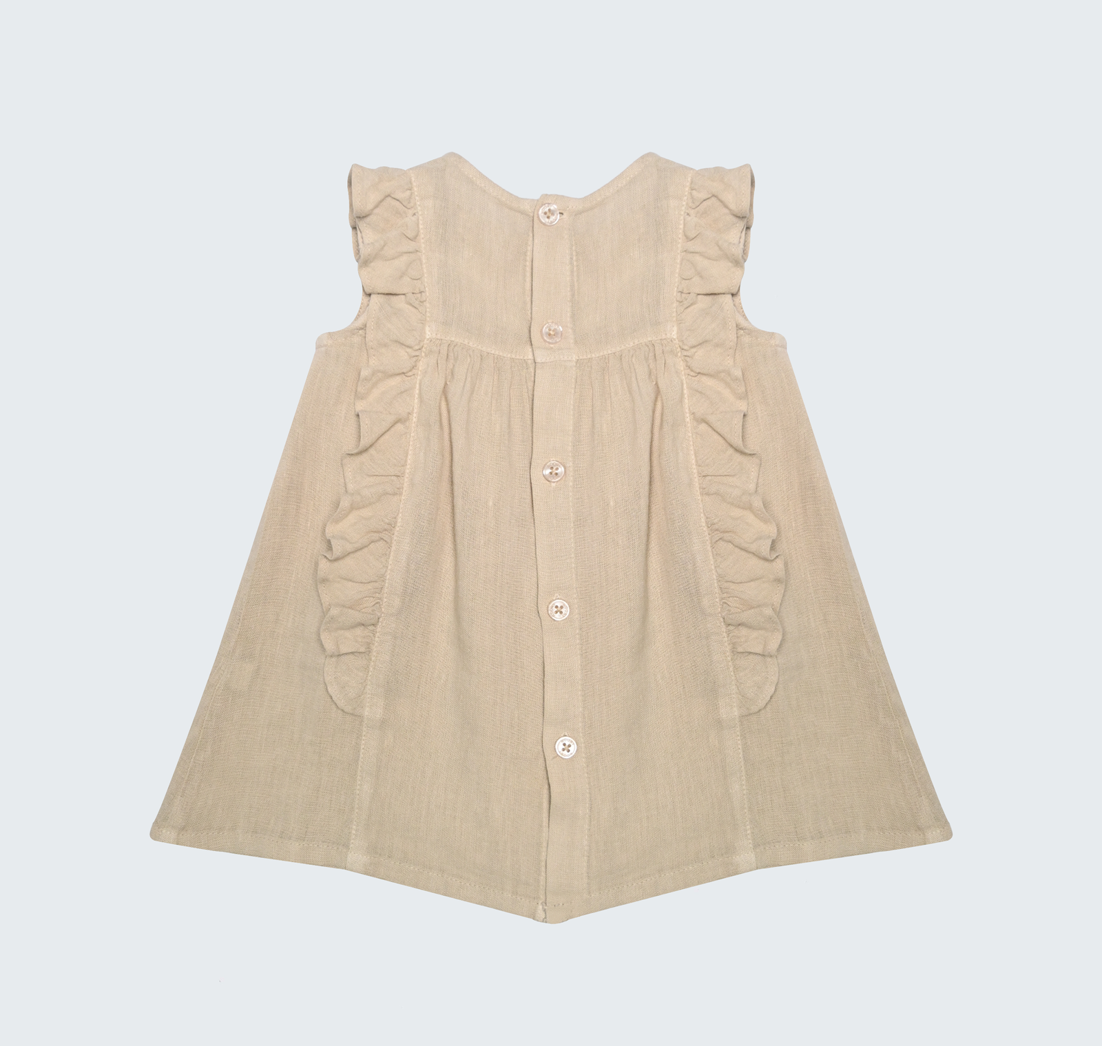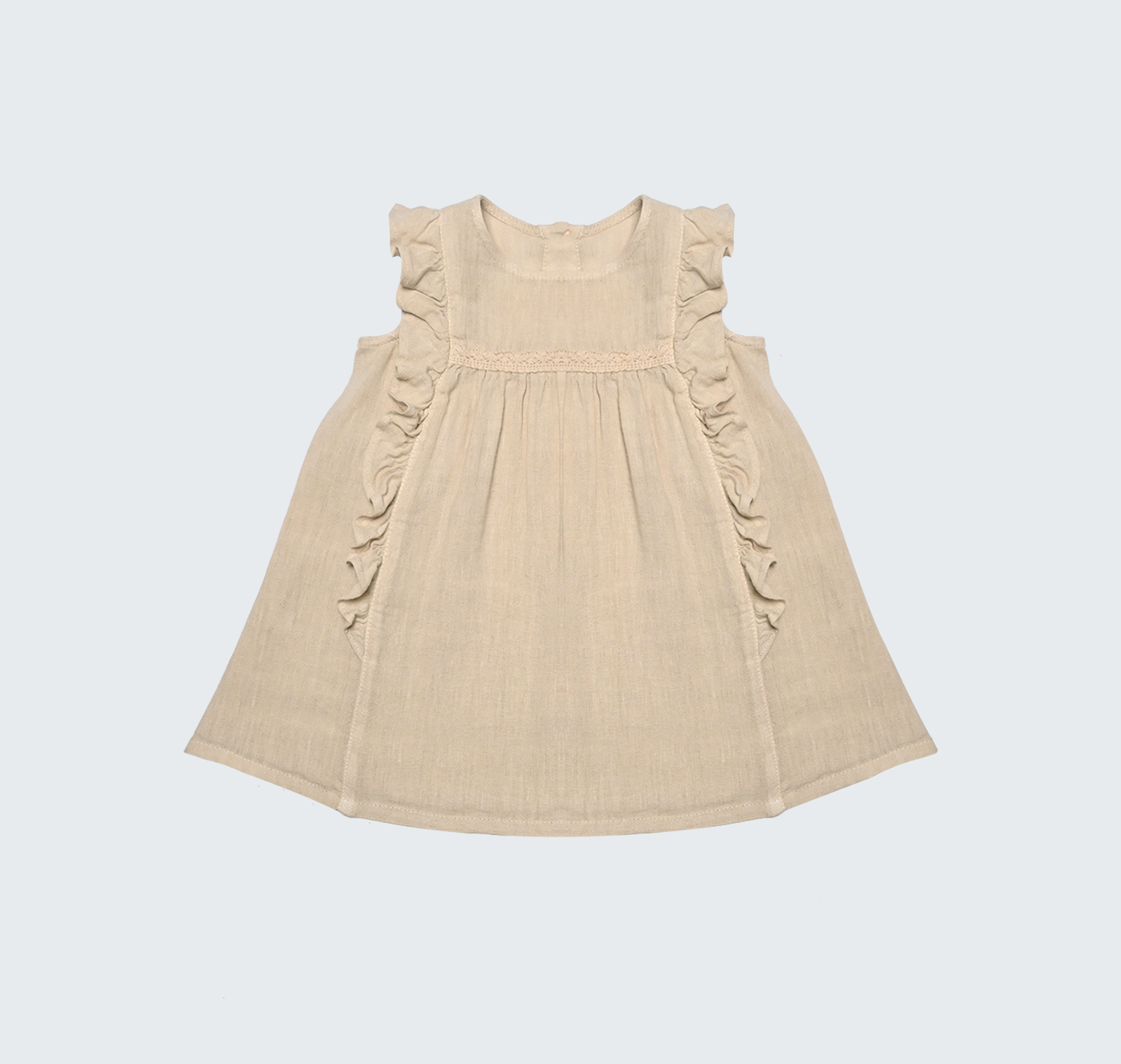Robe en lin beige, naturel avec volant et galon macramé sur le devant