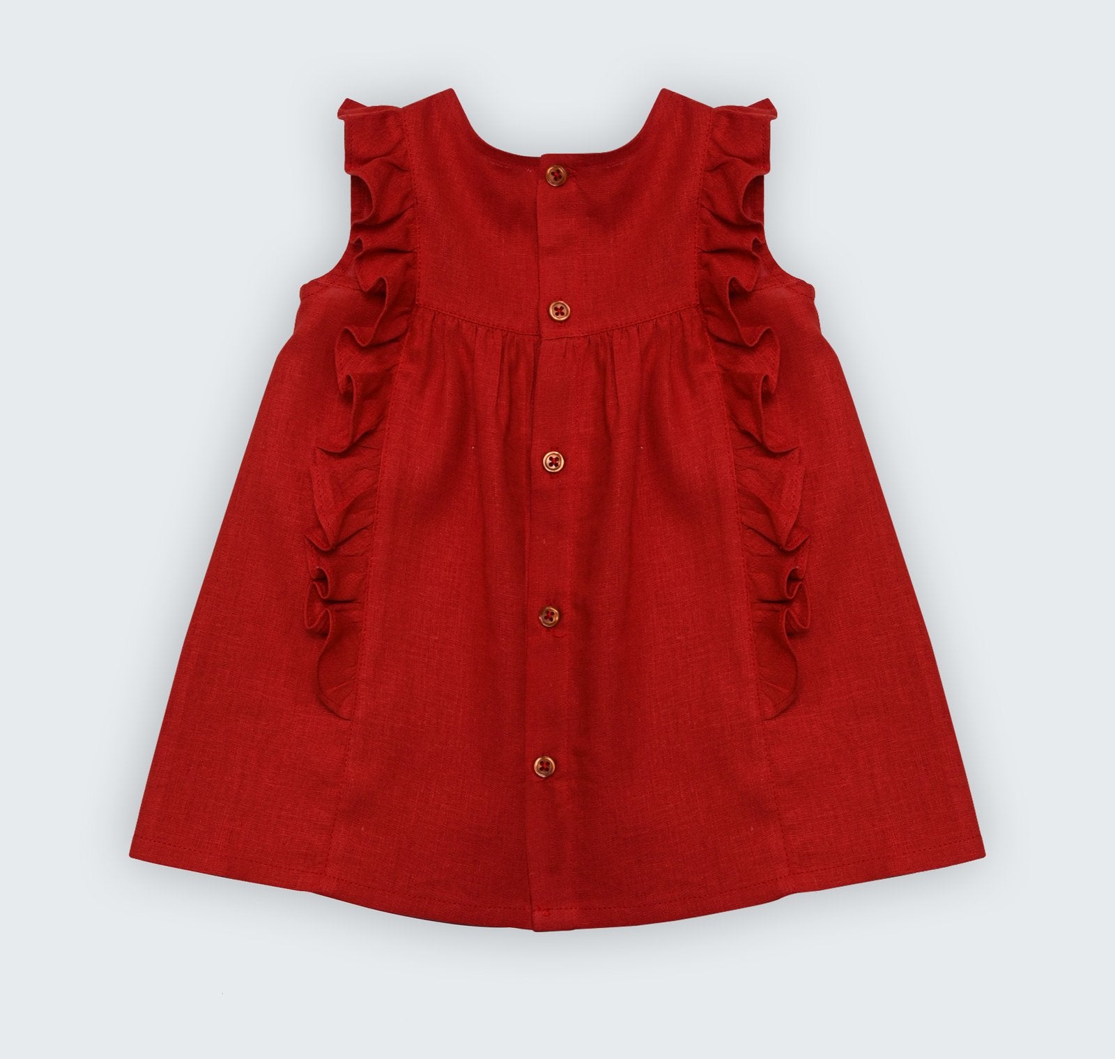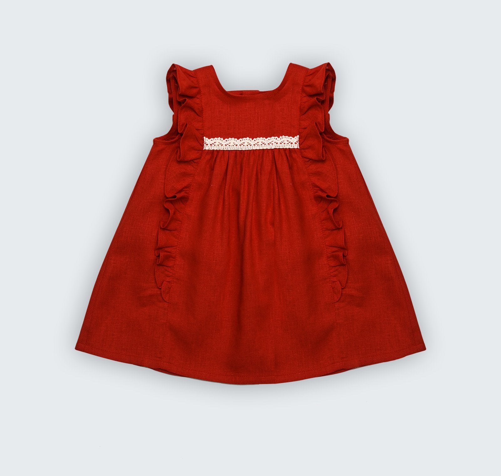 Robe en lin corail avec volant et galon macramé sur le devant