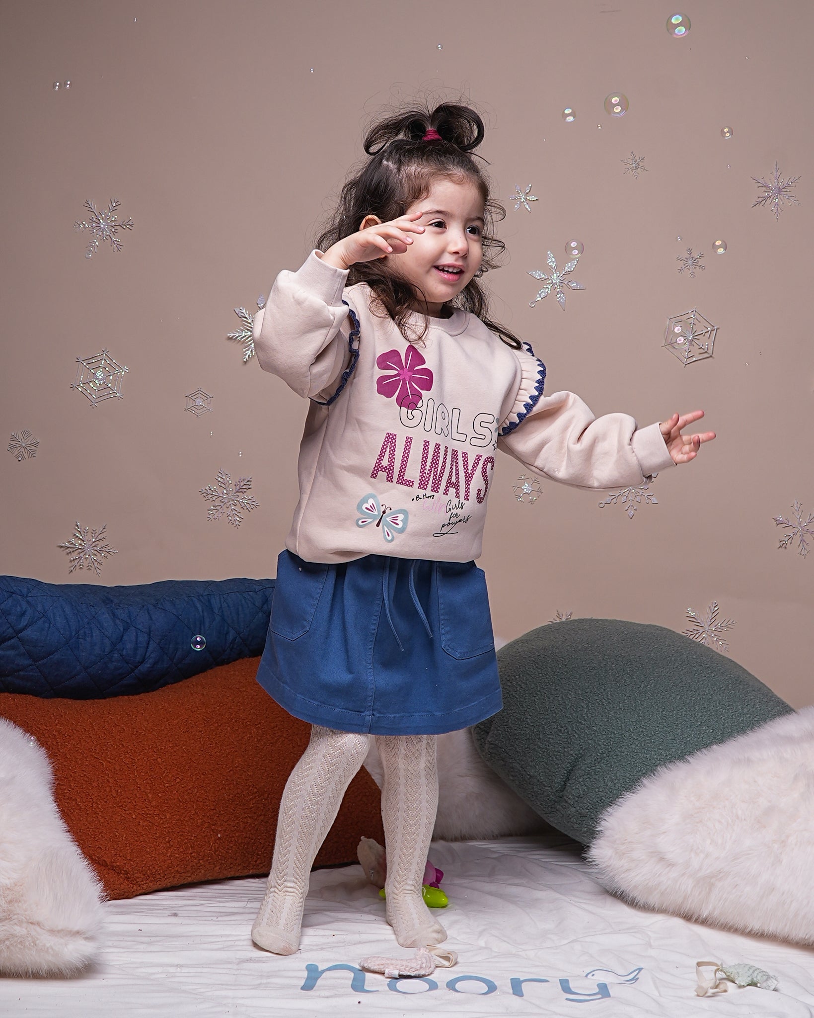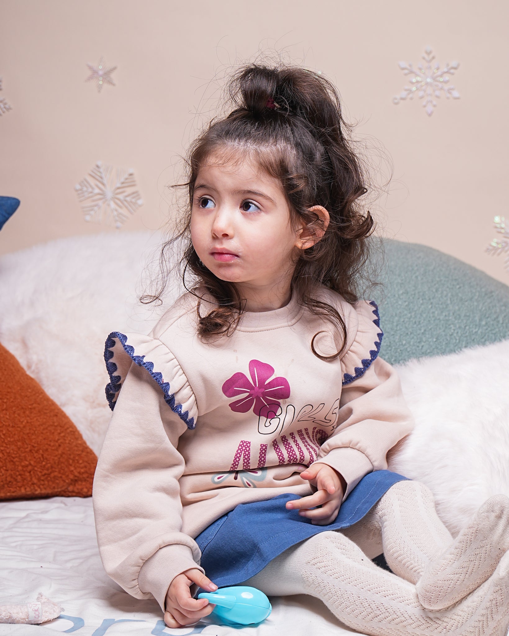 Ce haut est une pièce délicate qui combine le confort d’un sweat-shirt avec des détails élégants et féminins. Sa couleur beige crème et ses touches de bleu créent un contraste doux et moderne.